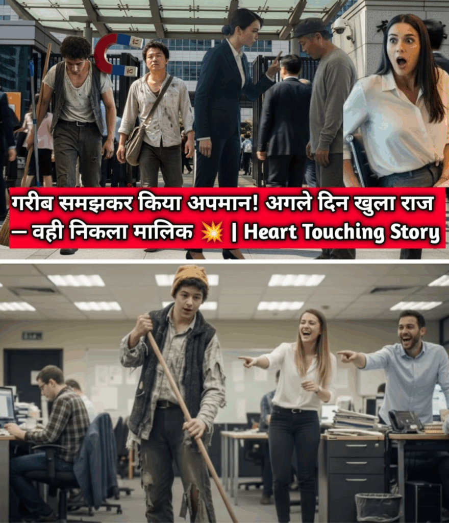 ऑफिस के अंदर जाते ही असिस्टेंट मैनेजर प्रीति, जो अपने सख्त स्वभाव के लिए जानी जाती थी, राहुल को डांटने लगी। “यहां क्यों खड़े हो? जल्दी सफाई करो!” आसपास के कर्मचारी उसका मजाक उड़ाते, ताने मारते, और कोई भी उसकी मदद नहीं करता। राहुल सब कुछ चुपचाप सहता रहा, क्योंकि वह देखना चाहता था कि यहां असली इंसान कौन है।