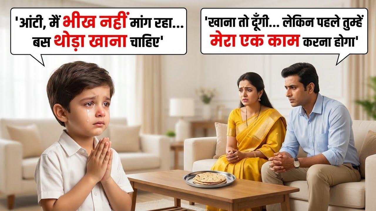 “आंटी, मुझे थोड़ा खाना दे दीजिए। अगर आपके यहां कोई काम हो तो मैं कर दूंगा। बदले में आप मुझे भरपेट खाना दे दीजिए।” मीरा उसकी मासूम आवाज सुनकर दंग रह गई। “अंदर आ जाओ बेटा।”