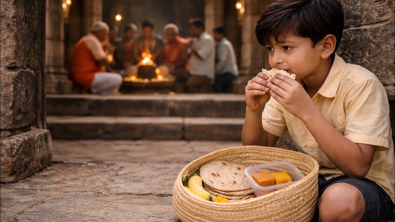 मंदिर की सीढ़ियों पर एक छोटा बच्चा बैठा था, गंदे कपड़ों में, कमजोर, उसी कोने में। बच्चा किसी के पीछे प्रसाद मांगने की हिम्मत नहीं कर रहा था। बस देख रहा था। आरव उसके पास गया, बच्चा डरकर सिर झुका लिया। आरव ने थाली रखी—रोटी, सब्जी, फल, दूध। बच्चा कांपते हाथों से थाली की तरफ बढ़ा, फिर रुक गया, पूछा, “पहले भगवान खाएंगे?” आरव का दिल फट गया। बच्चे को बाहों में भर लिया, “बेटा, भगवान आज तेरे सामने है, भगवान चाहते हैं कि तू खाए।” बच्चे की आंखों में आंसू आ गए, “तो क्या मैं अनाथ नहीं हूं?” “नहीं, आज से नहीं।”