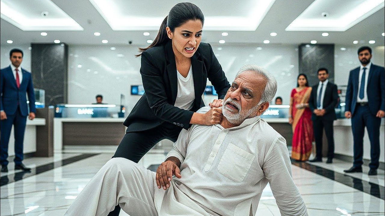धक्का इतना जोरदार था कि विराज धड़ाम से गिर पड़े। पासबुक और चेक हवा में उड़े, फिर जमीन पर जाकर बिखर गए। उस पल बैंक का शोर जैसे थम गया। सबकी नजरें बस एक जगह टिक गईं—एक बूढ़ा आदमी जमीन पर पड़ा था और उसकी गरिमा भी उसके साथ गिरी थी।