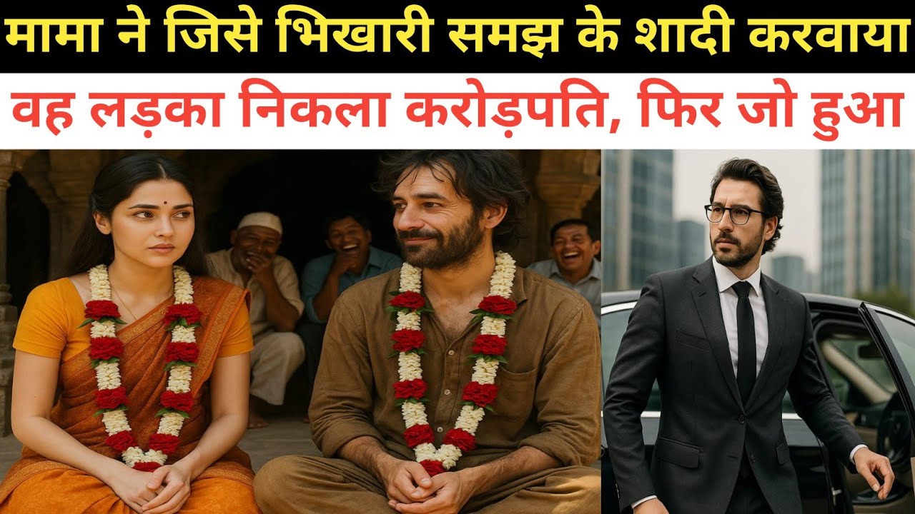 मगर वही खामोशी एक दिन उसकी सबसे बड़ी सजा बन गई। गांव में अफवाह फैल गई कि मायरा ने किसी अजनबी से बात की है। मामा की इज्जत पर सवाल उठ गया। मामी चिल्लाई, “अब इसे सबक मिलेगा!” और उसी शाम मामा ने पंचायत के सामने ऐलान कर दिया—कल सुबह इसकी शादी उस भिखारी से होगी, जो मंदिर के बाहर बैठा रहता है।