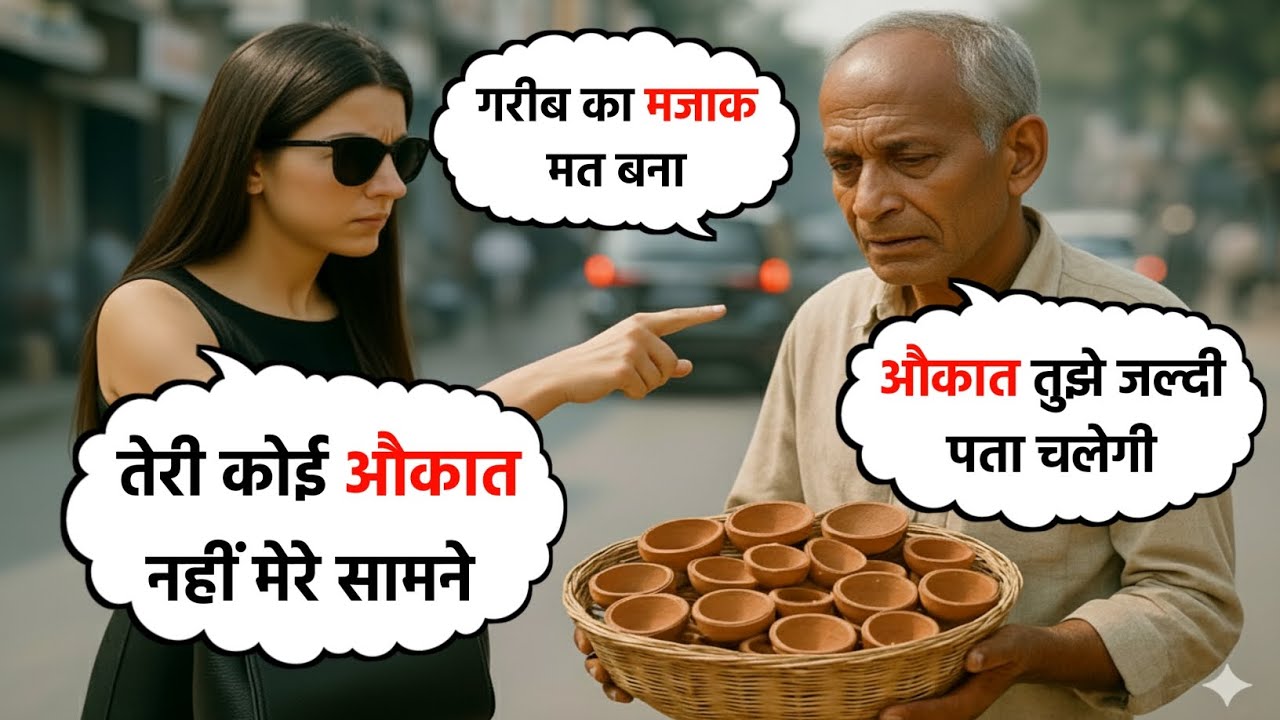 दिवाली की सुबह थी। शहर के सबसे बड़े बिल्डर मिस्टर आहूजा की बेटी तान्या अपनी चमचमाती मर्सिडीज में बैठी किसी जरूरी मीटिंग के लिए जा रही थी। अचानक उसकी गाड़ी लाल बत्ती पर रुकी और एक बुजुर्ग आदमी, जो मिट्टी के दिए बेच रहा था, उसकी कार के पास आया। उसके फटे कपड़े और नंगे पैर उसकी गरीबी की कहानी कह रहे थे। “बेटी, आज दिवाली है, कुछ दिए ले लो,” उसकी आवाज में एक विनती थी।