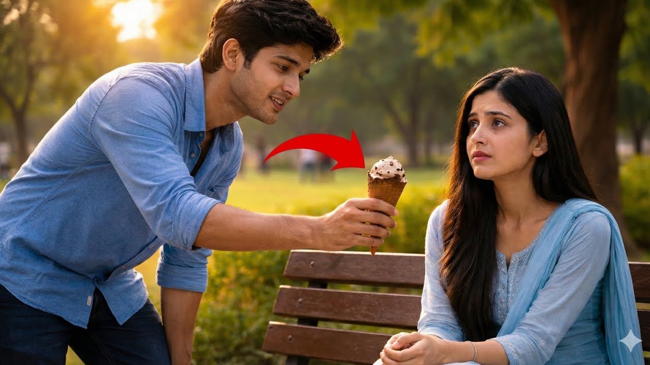 आरव ने हिम्मत जुटाई और अपनी साइकिल धीरे-धीरे उस बेंच की ओर बढ़ाई। “दीदी, आइसक्रीम लोगी?” उसने बड़े ही सौम्य स्वर में पूछा। सान्या ने अपनी लाल आँखों से उसे देखा और रुंधे हुए गले से कहा, “नहीं चाहिए, चले जाओ यहाँ से।” आरव मुस्कुराया और बोला, “पैसे नहीं लूंगा दीदी, ये मेरी तरफ से फ्री है।” सान्या चौंक गई। “फ्री क्यों? मुझे दया नहीं चाहिए।” आरव ने बड़ी सादगी से जवाब दिया, “दया नहीं दीदी, दवा है। मैंने सुना है कि जब दिल रोता है, तो मीठा खाने से थोड़ा सुकून मिलता है।”