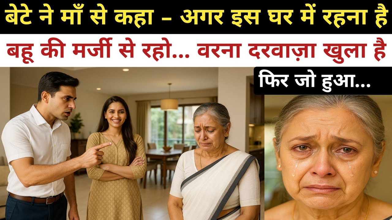 शाम को आदित्य घर लौटा। नेहा ने रोते-गुस्से में सब कुछ बढ़ा-चढ़ाकर बता दिया। आदित्य ने गुस्से में मां से कहा, “मां, आपको शर्म नहीं आई? आप मेरी पत्नी की बेइज्जती कर रही हैं। अगर आपको इस घर में रहना है तो उसकी मर्जी से रहना होगा, वरना दरवाजा खुला है।”