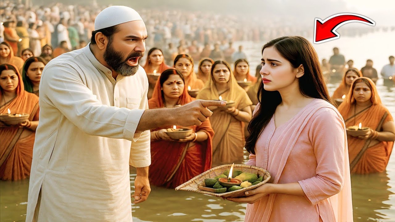 तभी नसीर खान रिश्तेदारों के साथ घाट पर पहुंच गए। उन्होंने जानवी को सूप लिए देख लिया। “यह क्या कर रही है तू?” भीड़ में खुसुर-फुसुर शुरू हो गई। जानवी ने सूप नीचे रखा और पिता की ओर देखा, “अब्बू, मैंने कुछ गलत नहीं किया, यह पूजा है, भक्ति है। इसमें क्या बुरा है?”
