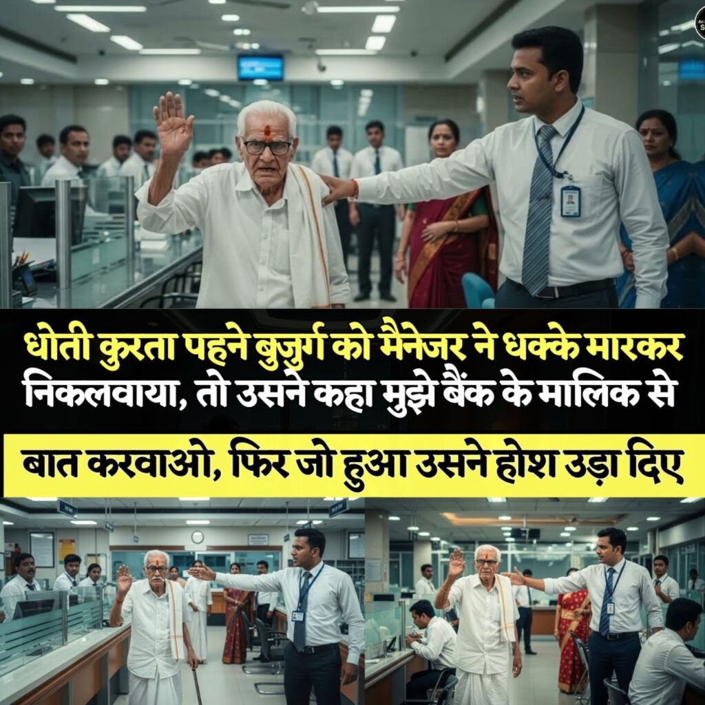 “धोती-कुरता पहने बुजुर्ग को बैंक मैनेजर ने धक्के मारकर निकाला, बुजुर्ग ने कहा – मुझे बैंक के मालिक से मिलना है, फिर जो हुआ सब दंग रह गए!”