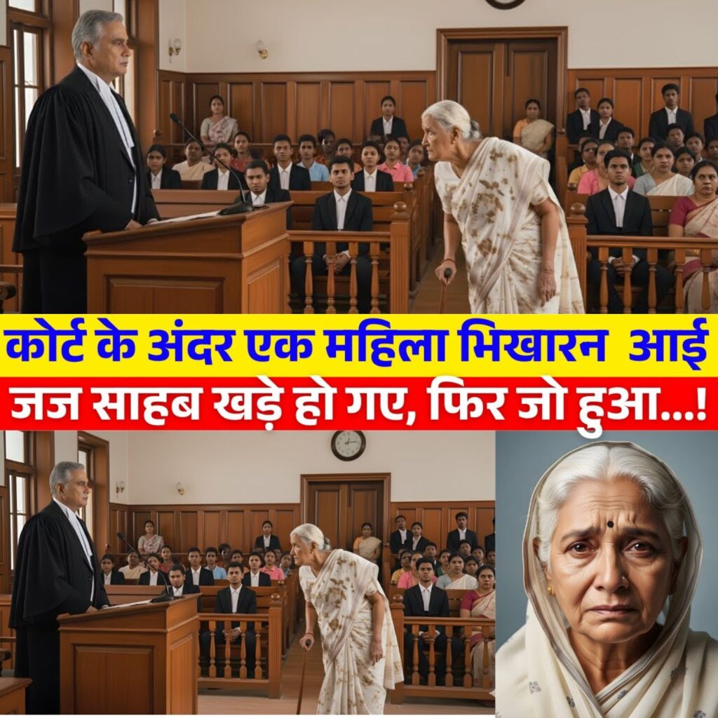 तभी, कोर्ट रूम का दरवाज़ा खुला और अंदर दाख़िल हुई एक बूढ़ी औरत—एक फटे हाल भीखारिन। लोगों की निगाहें तिरस्कार और आश्चर्य से भर गईं। उनकी साड़ी फटी थी, आँखें थकी हुई थीं और उनके काँपते पैरों के साथ गरीबी का एक बोझिल साया अंदर आ गया।