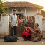 अर्थी उठी, लेकिन उस अर्थी पर बेटे का कंधा खाली था। मां के आंसुओं ने धरती को भिगो दिया और रीना का दिल भी टुकड़े-टुकड़े हो गया। मजबूरी यही थी कि अंतिम यात्रा बिना बेटे के ही निकल पड़ी। गांव की गलियों में सन्नाटा था, सिर्फ मंत्रों की आवाजें गूंज रही थीं। शांति देवी का हृदय टूट चुका था। पति की अर्थी को उठते देख उनकी चीख पूरे गांव में गूंज गई। रीना ने आंसुओं के बीच मां को संभाला और मजबूरी में पिता की चिता को कंधा दिया। गांव के लोग कह रहे थे, “बेटा होते हुए भी पिता की अंतिम यात्रा में शामिल ना होना सबसे बड़ा पाप है।”