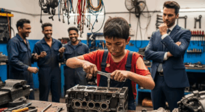 विवेक उस इंजन को बहुत ध्यान से देख रहा था, जैसे उसकी हर आवाज को समझ रहा हो। तीन मैकेनिक आपस में हंस रहे थे। एक बोला, “अरे छोटे, तू झाड़ू पहुंचा कर, यह इंजन तेरे बस की बात नहीं।” दूसरा बोला, “हां भाई, यह करोड़ों की कार है। कोई खिलौना नहीं।” तीसरे ने हंसते हुए कहा, “चल जा, जाकर पानी ले आ, यहां खेल मत कर।” विवेक कुछ नहीं बोला। वह शांत खड़ा बस इंजन को देखता रहा। उसकी आंखों में कुछ था—आत्मविश्वास या शायद भूख से जन्मी हिम्मत।