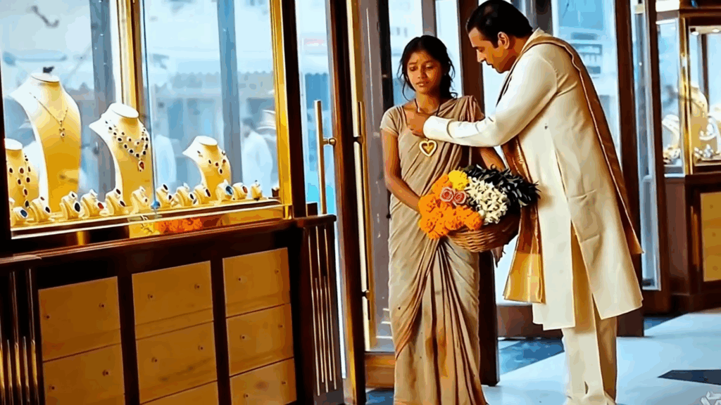 एक दिन, जब वह बापू बाजार में फूल बेच रही थी, तभी उसकी नजर एक आलीशान गहनों की दुकान पर पड़ी। दुकान के बाहर खड़े कठोर बाउंसर और चमकते हुए शोकेस ने उसे आकर्षित किया। वह सोचने लगी कि क्या वह अपने फूलों को वहां पेश कर सकती है, लेकिन तभी दो सुरक्षाकर्मी उसके पास आए और उसे अंदर जाने से रोक दिया।