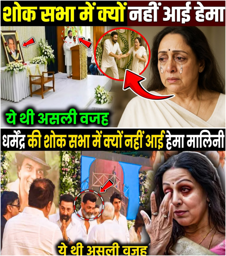 धर्मेंद्र देओल का निधन 24 नवंबर 2025 को भारतीय सिनेमा के लिए एक दुखद क्षण था। उनके जाने से पूरा देश शोक में डूब गया। 27 नवंबर को मुंबई में उनकी शोक सभा आयोजित की गई, जहां बॉलीवुड के दिग्गज सितारे पहुंचे। अमिताभ बच्चन से लेकर सलमान खान तक सभी अपने प्रिय “ही मैन” को श्रद्धांजलि देने आए। लेकिन इस भीड़ में एक चेहरा सबसे ज्यादा खोजा जा रहा था – हेमा मालिनी का।