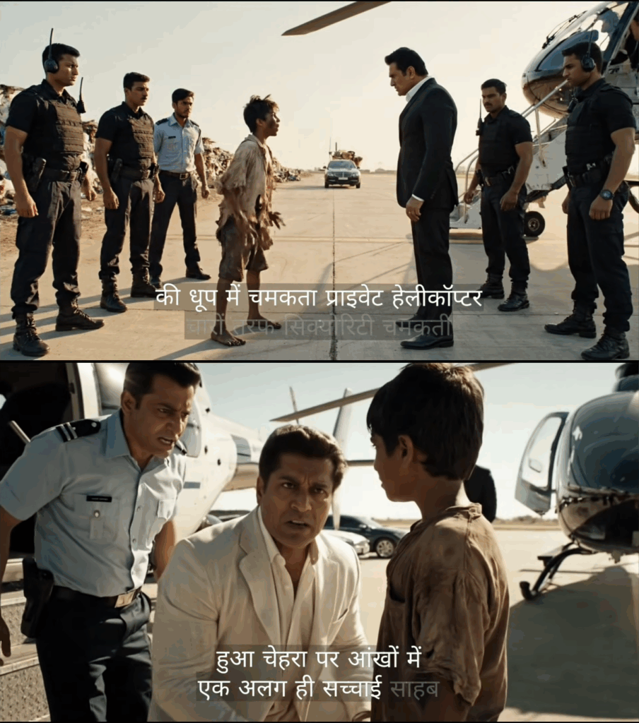 तभी एक चीख सुनाई दी, “साहब, मत जाइए! हेलीकॉप्टर में बम है!” यह आवाज एक 12 साल के बच्चे अमन की थी, जो दौड़ता हुआ आया। उसकी फटी कमीज, नंगे पैर और धूल से सना हुआ चेहरा था, लेकिन उसकी आंखों में सच्चाई की चमक थी।