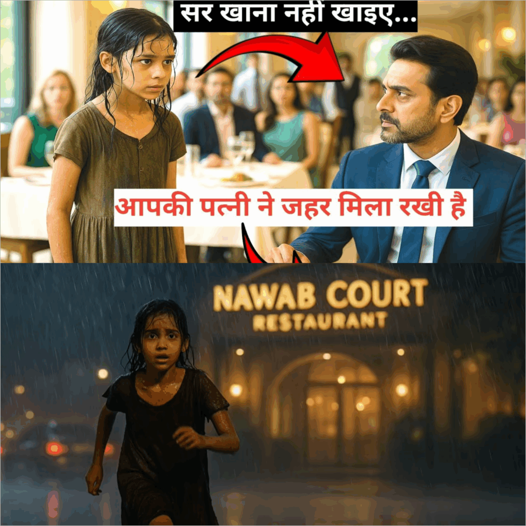 अंदर रोशनी थी, संगीत था, महंगी हँसी थी। और उसी हँसी के बीच एक मासूम चीख गूंजी—”खाना मत खाइए!” पूरा हॉल ठहर गया। हर चेहरा उस गीली बच्ची की तरफ मुड़ गया। किसी ने कहा, “यह कौन है?” किसी ने कहा, “पागल लगती है।” लेकिन उसकी आँखों में जो डर था, उसने सबको खामोश कर दिया। टेबल नंबर नौ पर नीले सूट में बैठे थे समर प्रताप सिंह—शहर के बड़े बिजनेसमैन। उनके सामने प्लेट में गरम खाना था। काव्या उनके पास पहुँची, हाँफती हुई बोली, “खाना मत खाइए, उस खाने में जहर है।”
