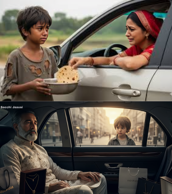 लेकिन उसकी आंखें उस बच्चे पर टिकी थीं। पहली बार वो करोड़पति बाप खुद को अजीब स्थिति में पाया। उसकी दौलत, उसकी शान, उसके गहने, उसके महंगे कपड़े सब कुछ उस बच्चे के सामने बेकार लग रहे थे। उसने महसूस किया कि उसका रुतबा और दौलत किसी भूखे बच्चे के दर्द के सामने कितने बेअसर हैं।