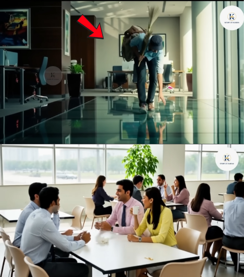 खाने के समय का माहौल रोज की तरह हलचल से भरा था। कुछ कर्मचारी जोर-जोर से हंस रहे थे। कुछ हाथ में कॉफी का मग लेकर गपशप कर रहे थे। आर्यन चुपचाप झाड़ू लेकर एक कोने में सफाई के काम में जुटा था। उसकी आंखें फर्श पर थीं लेकिन कान हर बात सुन रहे थे। अचानक एक महिला जोर से हंसकर इशारा करके बोली, “अरे देखो, नया सफाई कर्मचारी एकदम देहाती लग रहा है। लगता है जिंदगी में पहली बार किसी बड़े ऑफिस में आया है।”
