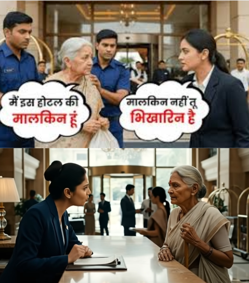 एक दिन, गंगा देवी होटल में गईं। उन्होंने अपनी साधारण साड़ी पहनी हुई थी और हाथ में एक पुराना झोला था। जब वह रिसेप्शन पर पहुंचीं, तो वहाँ की रिसेप्शनिस्ट राधा कपूर ने उन्हें भिखारी समझकर अपमानित किया। उसने कहा, “आप यहाँ क्या कर रही हैं? यह जगह आपके लिए नहीं है।” गंगा देवी ने शांत स्वर में कहा, “बेटी, मेरी यहाँ बुकिंग है।” लेकिन राधा ने उनकी बात को नजरअंदाज कर दिया।