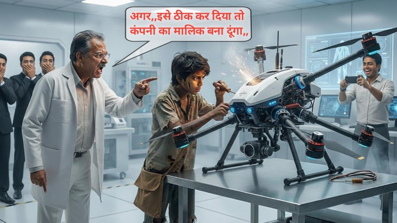 उसी समय, उनके चमचमाते जूतों के पास घुटनों के बल बैठा एक दुबला-पतला लड़का ड्रोन के टायर साफ कर रहा था। नाम था छोटू। असली नाम शायद किसी को याद नहीं। उम्र उन्नीस साल, लेकिन भूख और गरीबी ने उसे चौदह का बना दिया था। फटी बनियान, धूल से सना चेहरा, और हाथ में गंदा कपड़ा।