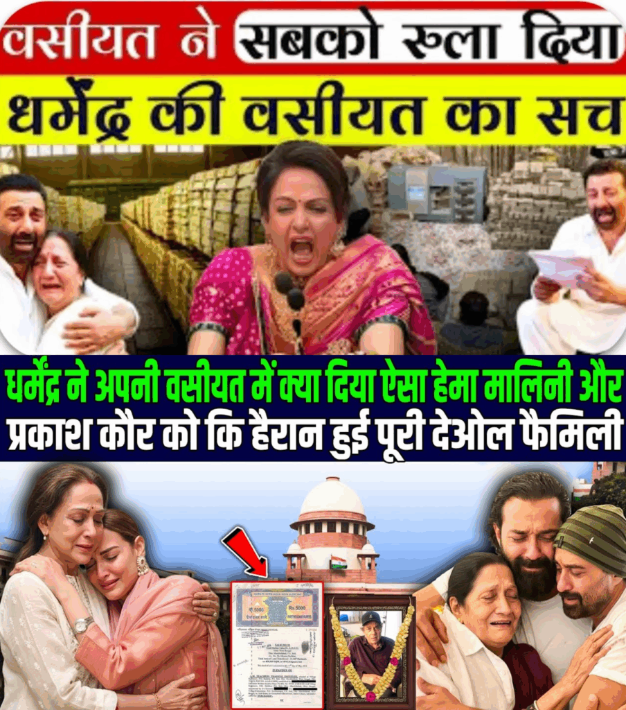धर्मेंद्र की वसीयत एक ऐसा दस्तावेज था, जिसमें उनके अंतिम विचार, प्यार, डर और पछतावा समाहित थे। जब उनके परिवार ने वह लिफाफा खोला, तो सबकी सांसें थम गईं। यह एक साधारण कागज नहीं था, बल्कि यह एक ऐसे इंसान के विचार थे जिसने दो परिवारों के बीच संतुलन बनाए रखा। वसीयत में सबसे पहला नाम उनकी पहली पत्नी प्रकाश कौर का था। धर्मेंद्र ने साफ लिखा था कि उनकी आधी संपत्ति प्रकाश कौर और उनके चारों बच्चों—सनी, बॉबी, अजीता और विजेता को दी जाए।