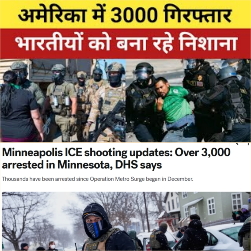 नमस्कार दोस्तों, मैं करमपाल। अमेरिका से एक बड़ी खबर आई है जो इस वक्त सुर्खियों में है। यह खबर अमेरिका के गृह विभाग (Department of Homeland Security) द्वारा दी गई है, जिसमें बताया गया है कि मिनेसोटा में 3000 से ज्यादा लोगों को गिरफ्तार किया गया है। इस गिरफ्तारी के दौरान सबसे अहम बात यह है कि इनमें भारतीय नागरिक भी शामिल हैं और यह गिरफ्तारी मक्सिको के बॉर्डर से अवैध तरीके से अमेरिका घुसे लोगों की हुई है। यह गिरफ्तारी ऑपरेशन मेट्रो सर्च के तहत की गई है, जो पिछले कुछ हफ्तों से मिनेसोटा और आसपास के शहरों में चल रहा है।
