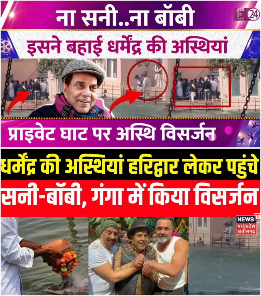 बॉलीवुड के दिग्गज अभिनेता धर्मेंद्र का निधन 24 नवंबर 2025 को हुआ, और उनके निधन के बाद से ही उनके चाहने वालों और परिवार में शोक का माहौल बना हुआ है। अब, 10 दिन बाद, देओल परिवार ने धर्मेंद्र को हरिद्वार में अंतिम विदाई दी है। इस अवसर पर, उनकी अस्थियों को मां गंगा की निर्मल धारा में प्रवाहित किया गया, जिससे उनके जीवन का एक अध्याय समाप्त हुआ।
