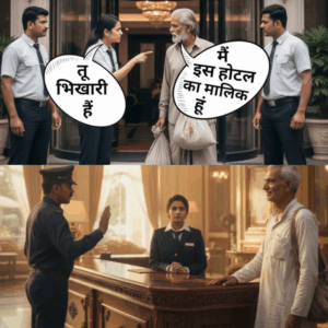 राजेंद्र सिंह ने रिसेप्शनिस्ट प्रिया की ओर देखा, “प्रिया, तुम्हारी यह पहली गलती है। इसलिए तुम्हें माफ कर रहा हूं। लेकिन याद रखना, इस होटल में कभी किसी को उसके कपड़ों से मत आकना। हर इंसान की इज्जत बराबर है।”