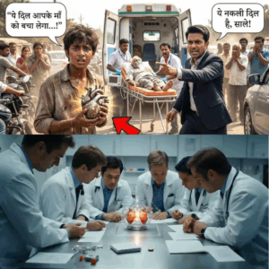 उसी पल, एक छाया उसके पास आई – फटे कपड़े, धूल-मिट्टी में सना हुआ विवेक। वह अपने बनाए हुए दिल को दिखाने के लिए अस्पताल आया था। उसने राघव को रोता देखा – “सर, क्या हुआ?” राघव ने ऊपर देखा, गुस्से में – “तू कौन है? क्या पागल हो गया है? मेरे बाप की जान से खेल रहा है?”