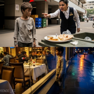 उसने अपना सिर ऊंचा किया और इतनी तेज आवाज में बोली कि पूरा हॉल सुन सके। “आप सब ऐसे घूर रहे हैं। शायद आपको खुद से यह पूछना चाहिए—क्यों? क्यों एक छोटे से बच्चे को हर रोज एक रेस्टोरेंट के बाहर बैठना पड़ता है, इस उम्मीद में कि शायद कोई अपनी प्लेट में थोड़ा सा खाना छोड़ दे। क्या यह घिनौना नहीं है?”