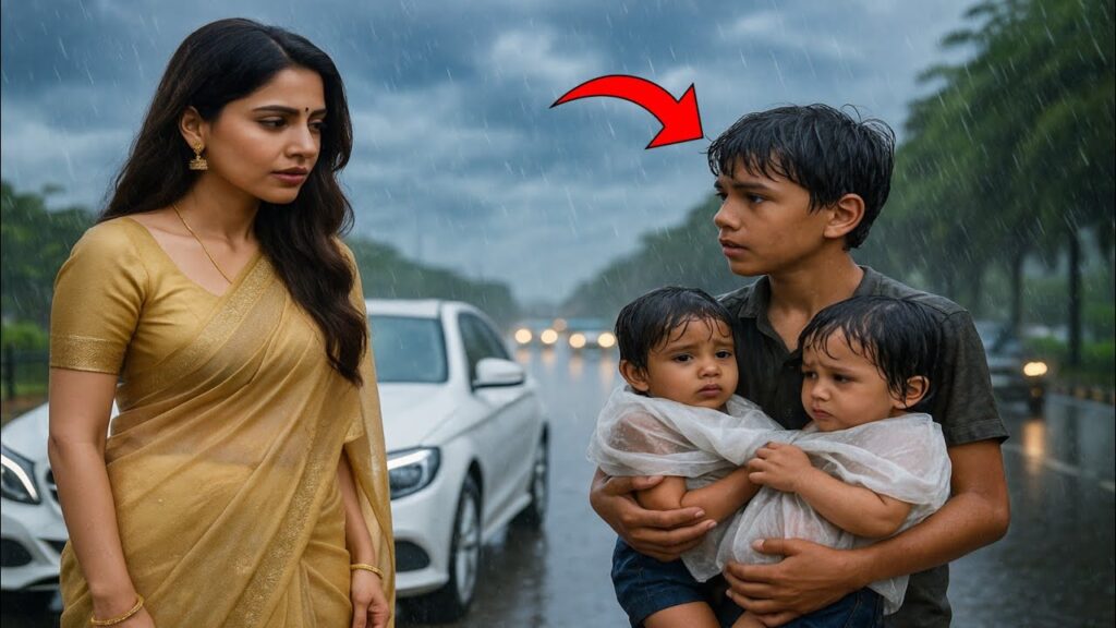 एक दिन, मुंबई में जोरदार बारिश हो रही थी। सड़कों पर पानी भर गया था। शालिनी अपनी काली Mercedes में बैठी थी, ड्राइवर गोपाल ट्रैफिक में रास्ता ढूंढ रहा था। अचानक शालिनी की नजर सड़क के डिवाइडर पर गई। वहां एक 13 साल का लड़का, सोनू, भीगते हुए दो छोटी बच्चियों को गोद में लिए बैठा था। दोनों बच्चियां बेहद कमजोर थीं, प्लास्टिक की थैलियों में लिपटी, धीरे-धीरे रो रही थीं।