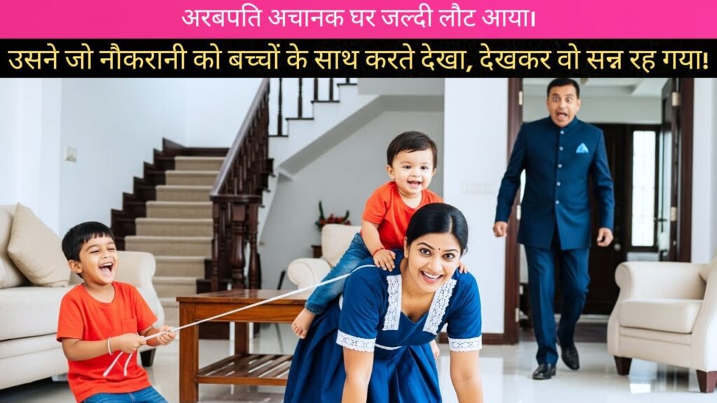 दृश्य हैरान कर देने वाला था। अंजलि फर्श पर घुटनों के बल बैठी थी, एक ‘घोड़ा’ बनी हुई थी। अयान उसकी पीठ पर बैठा था और आरव बगल में तालियां बजा रहा था। अंजलि हाफते हुए कह रही थी, “घोड़ा अब थक गया है छोटे साहब, अब घोड़े को पानी चाहिए!”
