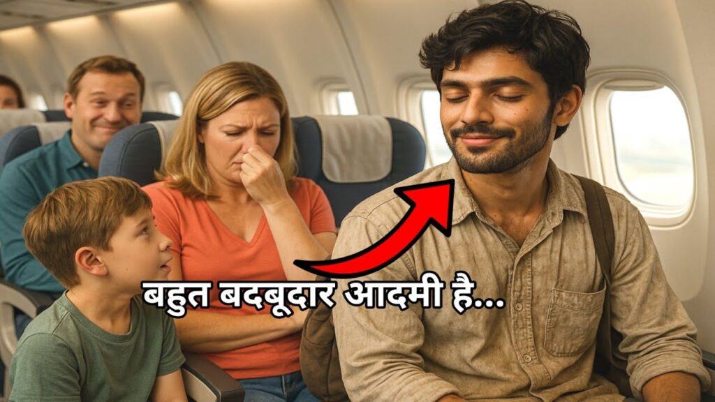उसके धूल भरे जूते, सस्ता बैग और झुर्रियों वाली शर्ट देखकर ऐसा लग रहा था जैसे वह किसी छोटे गांव से आया हो। उसकी आंखों में एक अजीब सा सुकून था, जो शायद अमीरी में नहीं मिलता। एयर होस्टेस मुस्कुराते हुए उसकी तरफ बढ़ी, लेकिन उसे देखकर उसकी भौंहें चढ़ गईं।