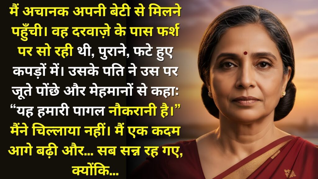 शादी के दो साल बाद, जब मैं बिना बताए अपनी बेटी निशा के घर पहुँची, तो वहां जो मंजर देखा, उसने मेरी रूह कंपा दी। समीर, मेरा दामाद, जिसे मैंने एक सफल रियलस्टेट कारोबारी समझा था, वह अपने दोस्तों के साथ शराब पी रहा था। निशा फर्श पर फटे कपड़ों में बेसुध पड़ी थी। समीर ने अपने महंगे जूते उसकी पीठ पर रगड़ते हुए अपने मेहमानों से हंसकर कहा, “यह हमारी पागल नौकरानी है। कभी-कभी इसे दौरे पड़ते हैं, तो यह यहीं सो जाती है।”