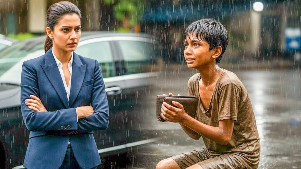 तभी ग्रैंड हयात होटल के गेट पर एक काली मर्सिडीज रुकी। शहर की सबसे बड़ी बिज़नेस आइकॉन नंदिनी रायचंद गाड़ी से उतरीं। जल्दबाजी में उनका महंगा लेदर का वॉलेट हाथ से फिसला और कीचड़ भरे पानी में गिर गया। नंदिनी बिना ध्यान दिए, फ़ोन पर बात करते हुए अंदर चली गईं।