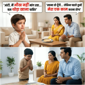 उसने हाथ जोड़कर बड़ी मासूमियत लेकिन दृढ़ता से कहा, “आंटी, मैं भीख नहीं मांग रहा… मुझे बस थोड़ा खाना चाहिए। अगर आपके यहाँ कोई काम हो, तो मैं कर दूंगा, बस बदले में पेट भर खाना दे दीजिए।”