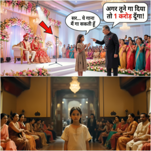 पहले तो किसी ने ध्यान नहीं दिया। फिर जब उसने थोड़ा ऊंची आवाज़ में दोबारा कहा, “सर, मैं गा सकती हूं,” विक्रम ने इरिटेशन में मुड़कर देखा—एक छोटी सी लड़की, गीले हाथ, बर्तन धोने वाले कपड़े, आंखों में डर और हिम्मत दोनों। पूरा हॉल मानो फ्रीज हो गया। कुछ लोग हंसने लगे, एक रिश्तेदार बोला, “भाई साहब, इसे मत चढ़ाइए स्टेज पर, आपकी और बेइज्जती हो जाएगी।”