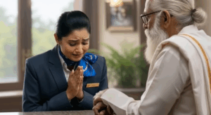 रेसेप्शन पर पहुंचकर प्रीति ने नज़र फेरते हुए कहा, “साहब, मैनेजर अभी…” रामनारायण ने आवाज़ में अब नरमी नहीं, पर दृढ़ता थी, “बेटी, मैंने बहुत इंतज़ार कर लिया। मैं मैनेजर से ख़ुद बात करूंगा।” लाउंज में बैठे लोग उन पर तंज कसा रहे थे, पर उनकी सदा-मुस्कान अडिग रही। वे सीधा मैनेजर के बे शीशे वाले कक्ष की ओर बढ़े। बाहर खड़ी चौकीदार ने बड़े अंदाज़ में पूछा, “क्या मामला है?” उन्होंने सिर झुकाते हुए कहा, “मैनेजर से मिलने का आदेश मिला है।” चौकीदार ने दरवाज़ा खुलवाया और रामनारायण अंदर गए।
