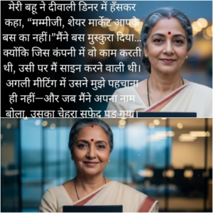 कमरे में सन्नाटा छा गया। अंशुल ने मेरी तरफ देखा—जैसे पहली बार उसे एहसास हुआ कि उसकी मां सिर्फ चुप रहने वाली औरत नहीं है।