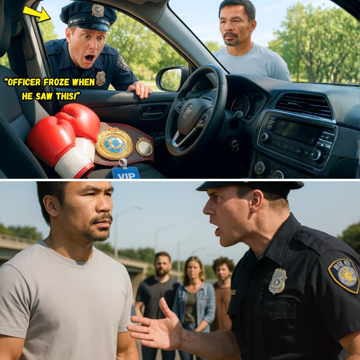 Paglapit ng pulis sa sasakyan ni Pacquiao, inutusan siyang magpakita ng lisensya at mga dokumento. Nang matapos ang mabilisang pagsusuri, ibinigay ni Pacquiao ang kanyang mga papeles at sumunod sa mga utos ng pulis. Ngunit ang hindi inaasahan ay nang tiningnan ng pulis ang loob ng sasakyan ni Pacquiao. Ang matinding sorpresa ay dumapo sa mukha ng pulis nang makita niya kung sino ang kasama sa loob ng sasakyan.