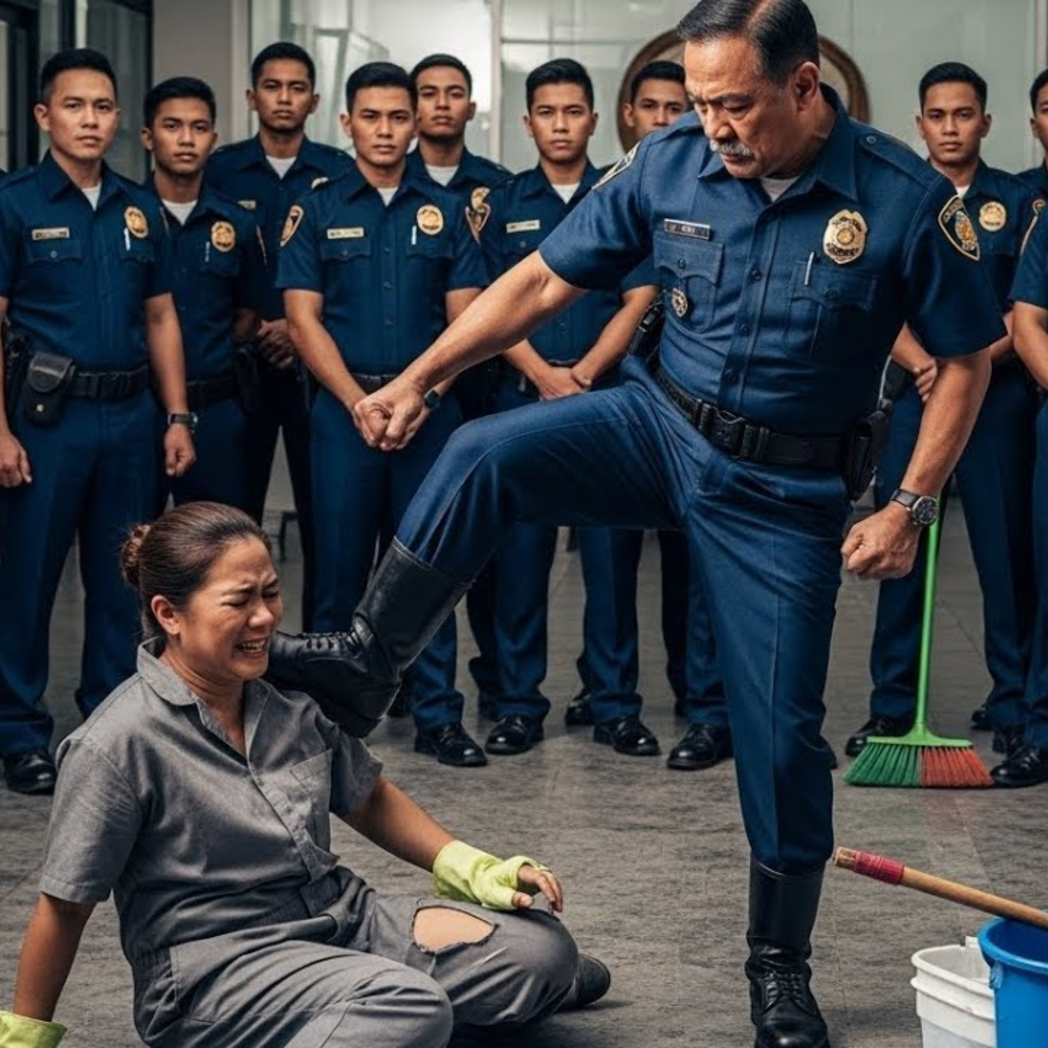 “Hoy, basura! Tumabi ka nga, istorbo ka sa trabaho ng tunay na tao!” sigaw ni Police Sergeant Marvin Dela Cruz, kilalang mayabang, kilalang mahilig mang-abuso sa mga mahihina. Hindi siya nagdalawang-isip na ipahiya ang janitress, na halos mapaluhod sa sakit at hiya. Ang mga tao sa paligid ay napatingin, ang iba ay naglabas ng cellphone, nagvideo, pero walang tumulong. Sa Pilipinas, madalas, ang mahirap ay tahimik, ang may kapangyarihan ay malakas ang loob.